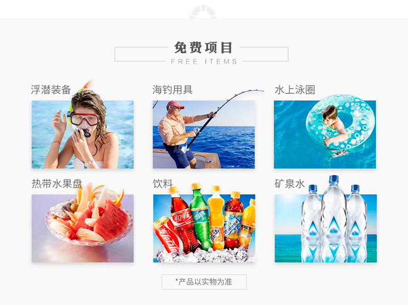 選配項目: 摩托艇、飛魚、香蕉船、水上飛行器、飛拖、滑板、托傘